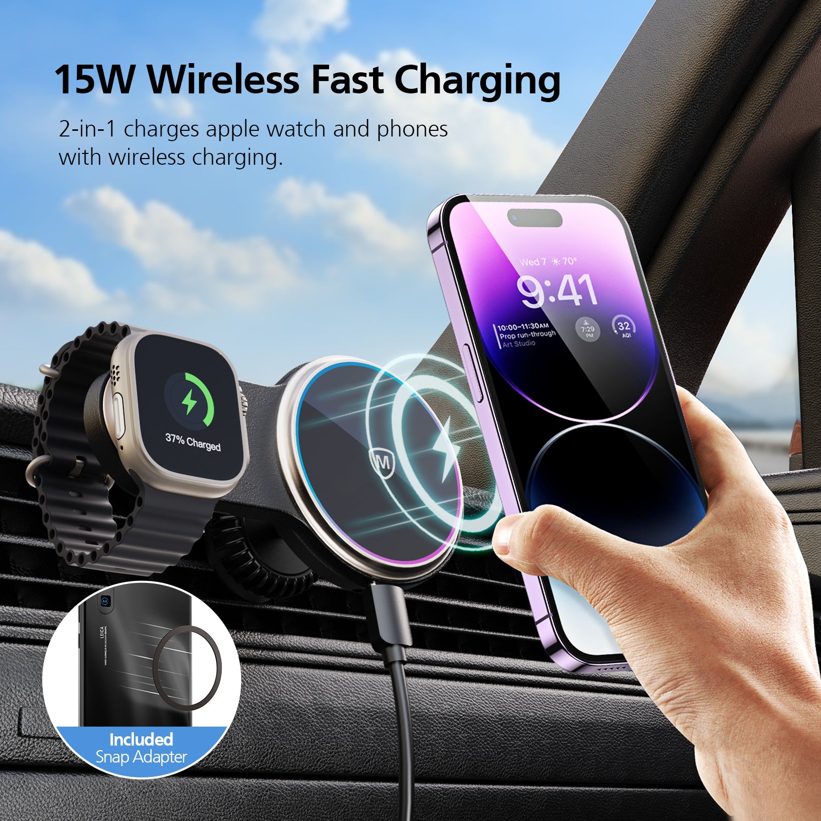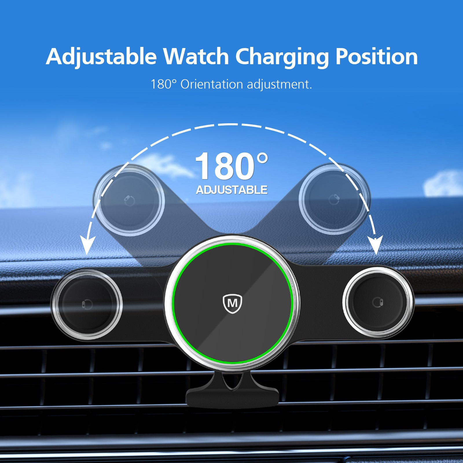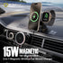2 in 1 Magnetic Wireless Car Mount Charger: Charge both your phone and smartwatch simultaneously with this versatile 2-in-1 car mount charger. The magnetic design ensures a secure hold, while the smartwatch charging position rotates 180° for optimal convenience.