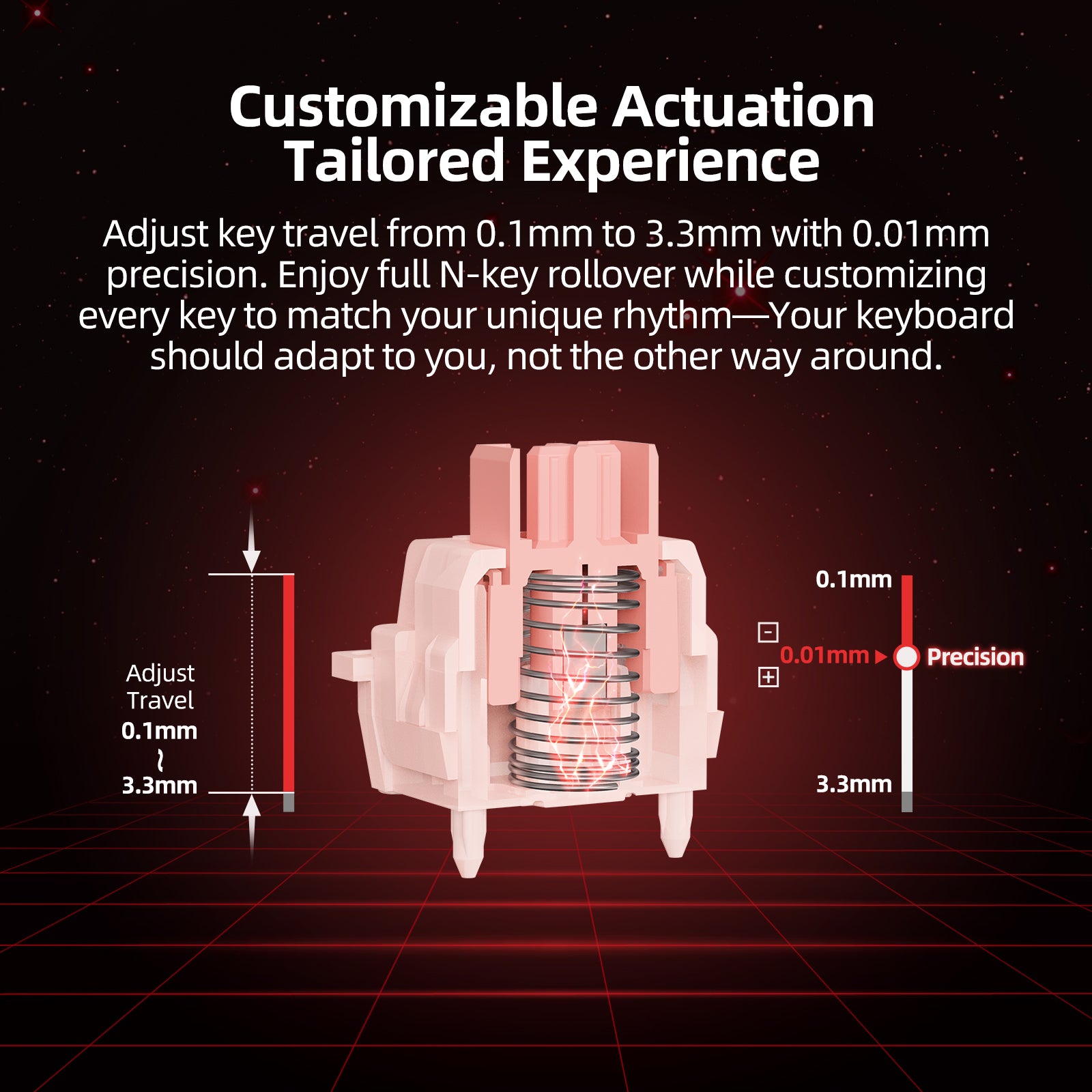 Adjustable Magnetic Switches: Adjust key travel from 0.1-3.3mm with 0.01mm precision. Every key supports 4-key mapping, allowing layered inputs per press. Customize key travel and remap keys to fit your preferences, optimizing every button to work and play your way.