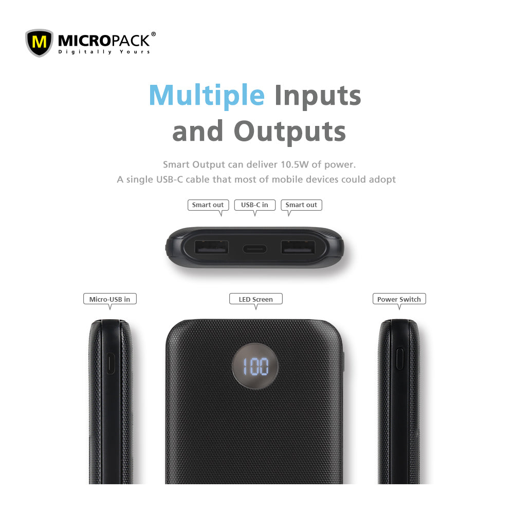 双输入和输出:新一代 USB-C 和 micro USB 输入,双 USB 输出可同时为 2 个设备充电。