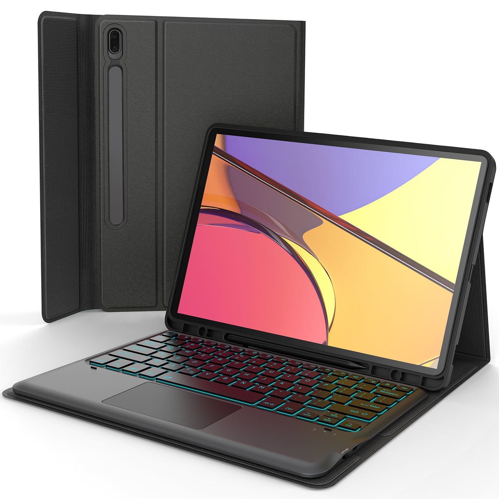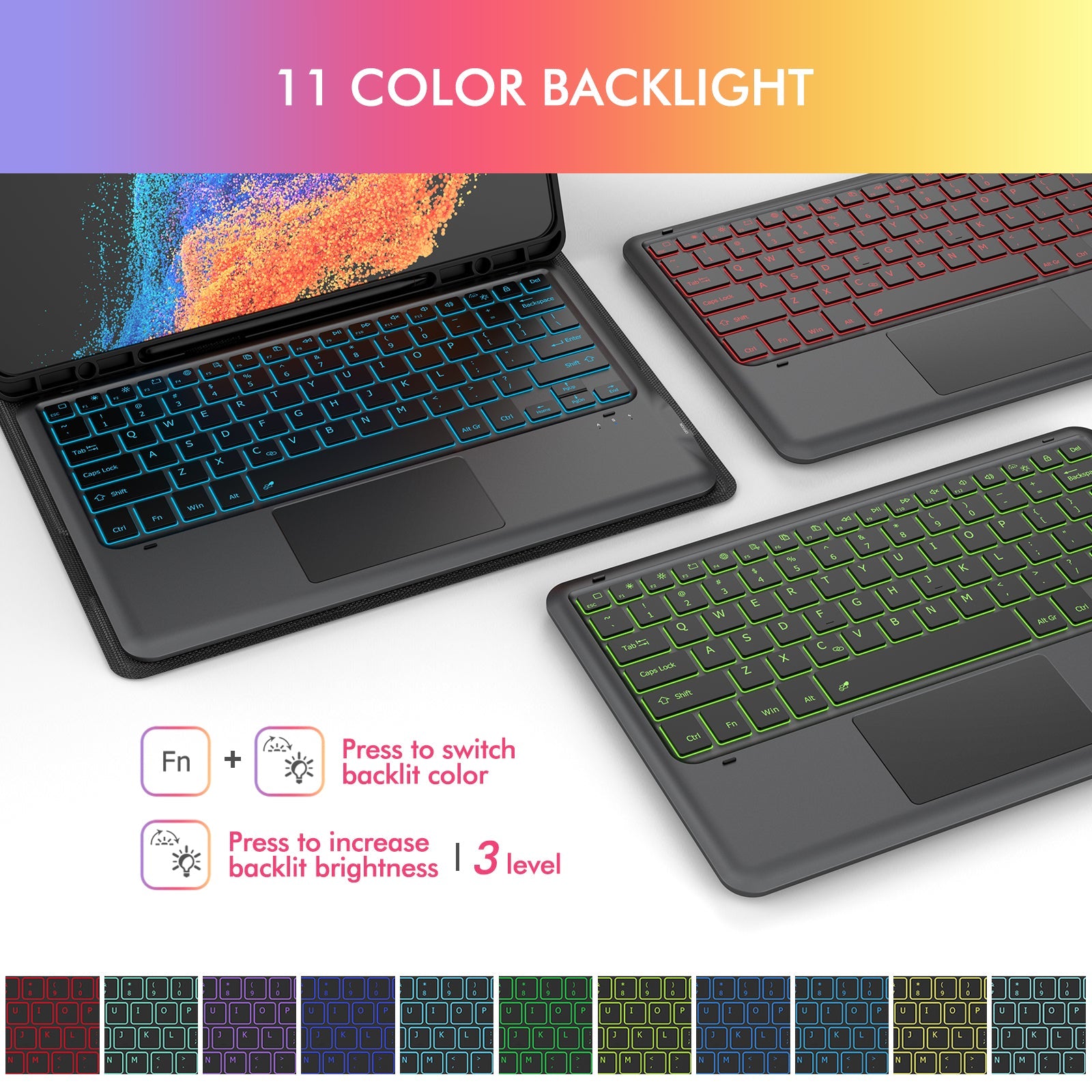 11 色背光键盘和呼吸背光:适用于三星 Galaxy 平板电脑的高级笔记本电脑键盘保护套配备 11 种鲜艳的背光颜色、3 个可调节亮度级别和 11 种颜色呼吸灯、间隔良好的剪刀式开关,旨在最大限度地提高打字员的乐趣,准确打字即使在较暗的房间里也能舒适地使用三星 Galaxy 平板电脑键盘。借助一整排快捷键,只需按一下按键即可完成更改背光颜色、平板电脑亮度级别、音量控制、媒体键等。